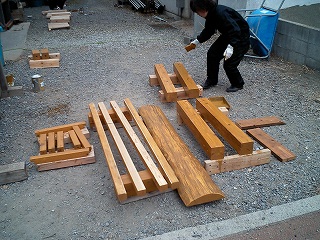 ・サンダーを使い座面となる竹の外皮をはぎ、ペンキを塗りやすくした.